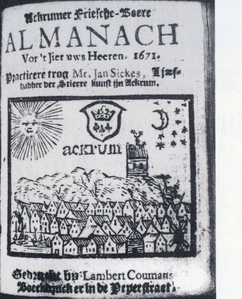 Boven: Het wapen van Akkrum komt voor op de Ackrumer Friesche Boere Almanack van 1671.