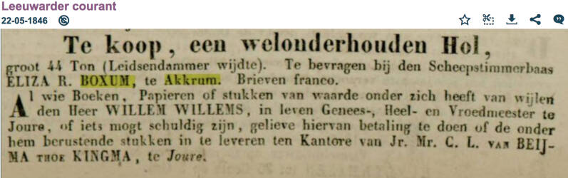 De scheepstimmerwerf van de gebroeders H. en W. Boxum in Akkrum is een van de âldsten van Akkrum. Deze was gevestigd aan de Polsleat en het Leechein. In het pand dat vandaag-de-dag bewoond wordt door ...... Kooistra. Daarvoor was het de timmerwerkplaats van Hessel Hoekstra. Die heeft er jaren gezeten met zijn timmerbedrijf. Naast de scheepswerf was er in Akkrum ook nog een goud- en zilversmid Jan Boxum. (Was dit familie van elkaar?).