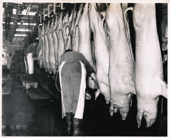 Boppe/boven: De varkens waren geslacht in het slachthuis en gingen vervolgens via een rail over het dak naar de koelcellen waar ze ' s morgens verder werden bewerkt tot o.a. Karbonadestrengen. Ook werden de halve varkens verpakt in jute om verscheept te worden naar buitenland.