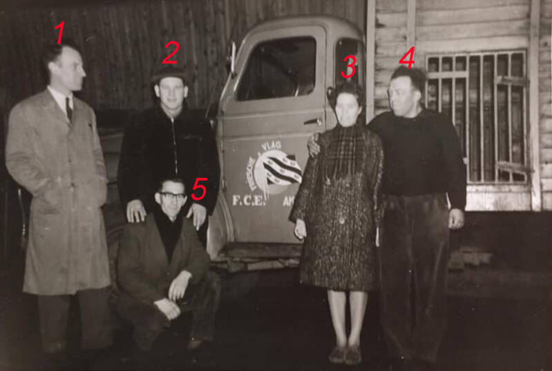 Boppe: Kantoor personiel FCE efkes skoft mei: Nr.1 , 2, 3 Greta de Jonge, 4 Ap Krim, 5 Roelof Bijlsma, 6 , 7 Tiny de Haan?, 8 Ida Mulder, 9 . Skoft foar de oerbliuwers op 'e stoepe fan de achteryngong fan it kantoar. Om 1950 hinne.