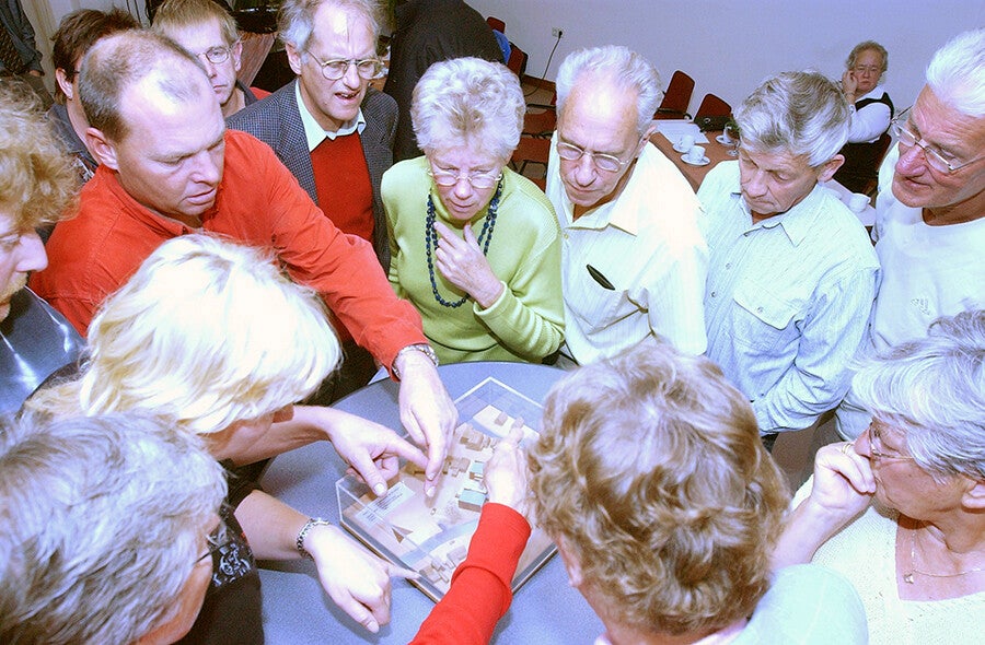 Foto's onder en boven: In oktober 2005 wordt de maquette van het te bouwen appartementengebouw gepresenteerd, en kon een ieder het bekijken.
