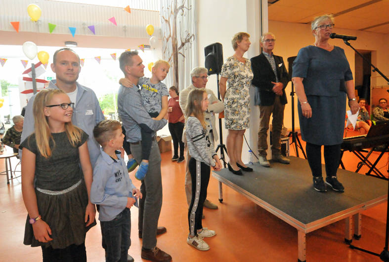 Foto: boppe links: Tjitte met dochter Marrit en zoon Jorrick de Jong, Jurjen de Jong met zoon Arijan en dochter Alina de Jong, schrijver Luuk de Haan, Juf Petra Ouwehand, PakeArjen de Jong en direktrice Gea van Wieren.