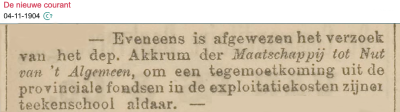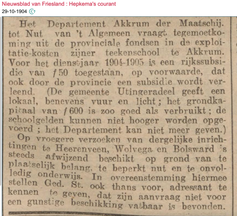 Afb. links boven : De oprichting van de tekenschool. © Leeuwarder Courant mei 1896.