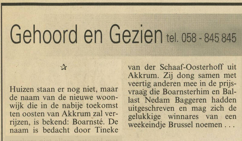 Boppe-boven: De prijsvraag hoe de naam van de nieuwe woonwijk van Akkrum-Oost zou heten is gewonnen door Murk en Tineke van der Schaaf- Oosterhoff. De naam wordt Boarnsté