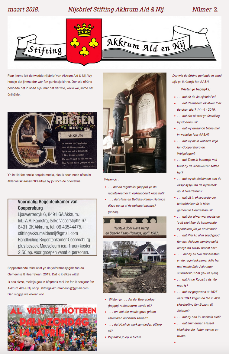 april 2018. Nijsbrief Stifting Akkrum Ald & Nij. Nûmer 2.