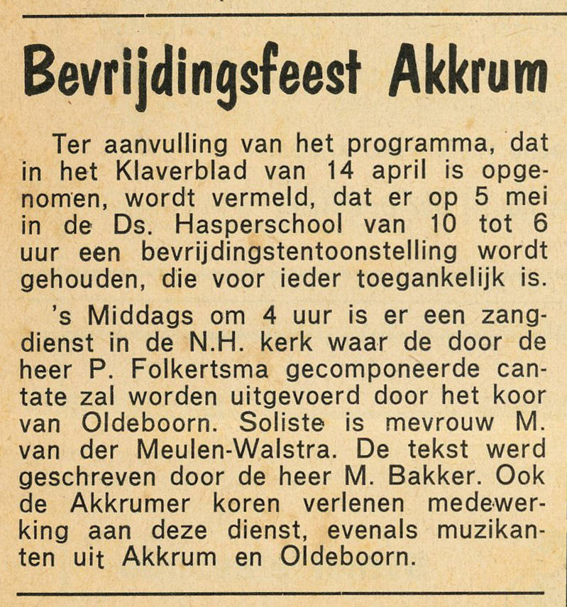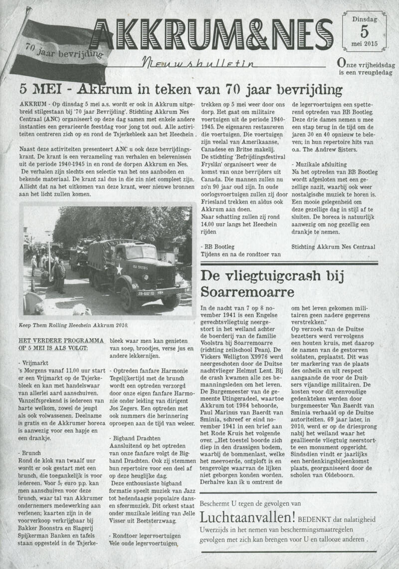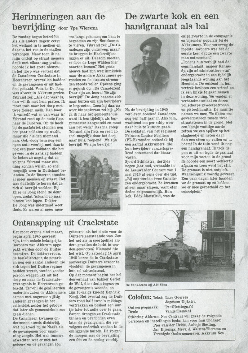 Het eerste en tevens het mooiste feit van de oorlog is natuurlijk de bevrijding van Nederland, van Friesland van Utingeradeel en vooral van Akkrum & Nes. Te danken aan het Regiment van The Princess Louise 'Fusiliers van Halifax - Canada. (P.L.F.). (16 juni 1945 tot 1 december 1945). Veel oud Akkrumers hebben goede herinneringen aan de tijd, dat deze Kanadezen hier gehuisvest waren. (Lees verhalen oud Akkrumers en Nessers).