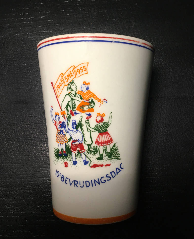 Boppe: De "10e Bevrijdingsdag, 5 mei 1945-1955", stiet op dizze prachtige beker, dy't Theo Mast krigen hat op skoalle yn 1955. Alle oare bêrn (Ik tink Lândelik) ha dizze ek krigen natuerlik.