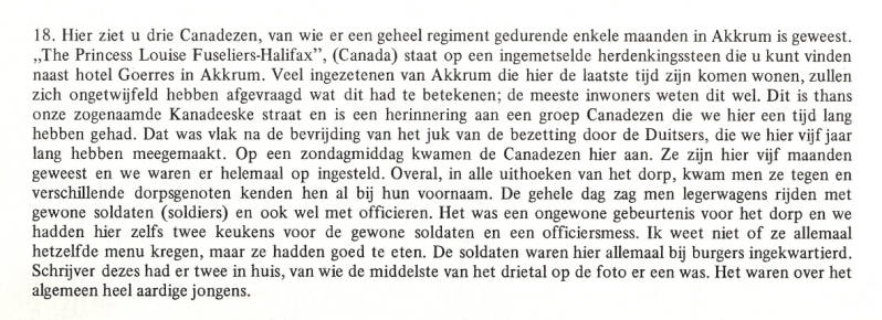 Foto ûnder en rjochts: De plakette boppe de door fan húsnûmer 49 werinnert de ynwenners fan Akkrum oan it ferbliuw fan it Regiment Princess Louise Fusiliers út Halifax Kanada fan 16 juny 1945 oant 1 desimber 1945. Sy wiene de befrijers fan Akkrum. 'De Kanadeeske strjitte' hiette earst 'De Princess Louise Fuselierstrjitte', by de ynwenners al gau feroare ta 'P.L.F. strjitte', wernei it letter ofysjeel de 'P.L.F. stjitte' neamt is. Wer letter is de strjitte feroare yn 'Kanadeeske strjitte'.