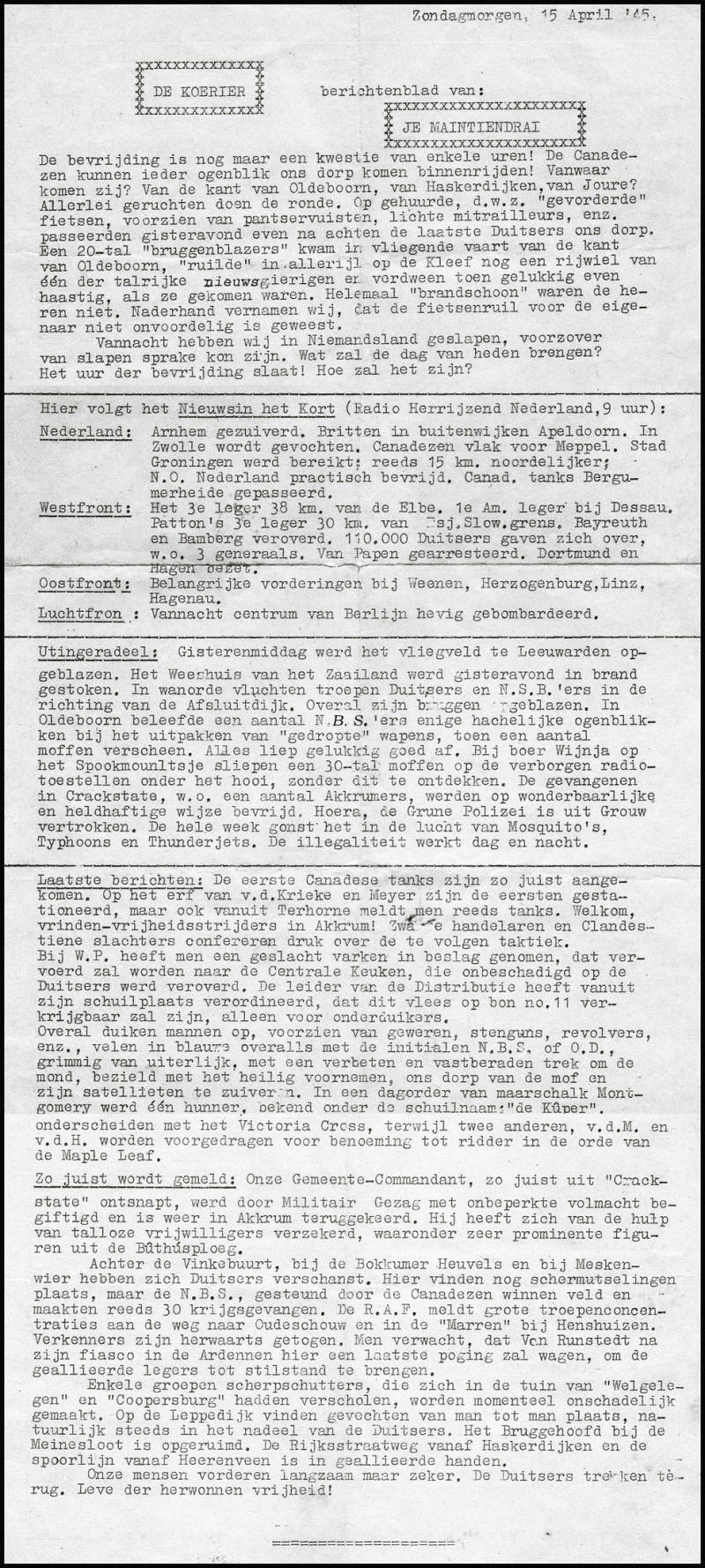 Boppe/boven: Tekst van 'De Koerier' berichtenblad van 'Je Maintiendrai'. (15 april 1945).