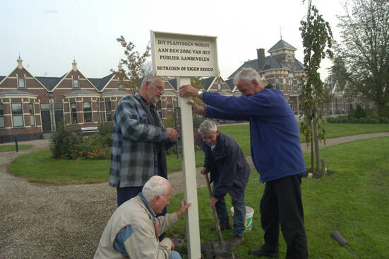Boppe links: foar de beide tagongspoarten wurdt in fiskroaster oanbrocht, sadat de karpers net mear ûntsnappe kinne (april 2012). Boppe rjochts: it buordsje ‘Verboden te vissen’ wurdt pleatst troch Douwe van der Meulen, Geart de Jong en Tamme Velstra (oktober 2006).