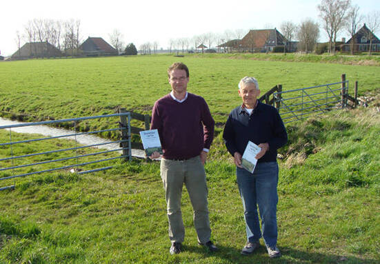 Boven: de oude ploeg bezig met het bestuderen van een nog oudere kaart. Vlnr: Siebe van Dam, Jehannes Bakker, Merten Bakker, Jan Calsbeek, Hinne de Haan (Grou?), Tjitte de Wrede, Nammele Waringa, (Aldeboarn) en Abele Middendorp.