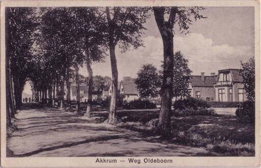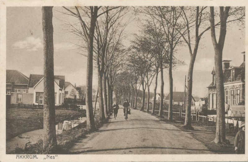 Boppe; De Boarnsterdyk, sjoen fan Aldeboarn ôf, links fan 'e midden (tusken 4e en 5e beam links) de boerderij fan Santema tusken de beammen en ek links it paad nei de buorkerij fan de famylje van der Meer!