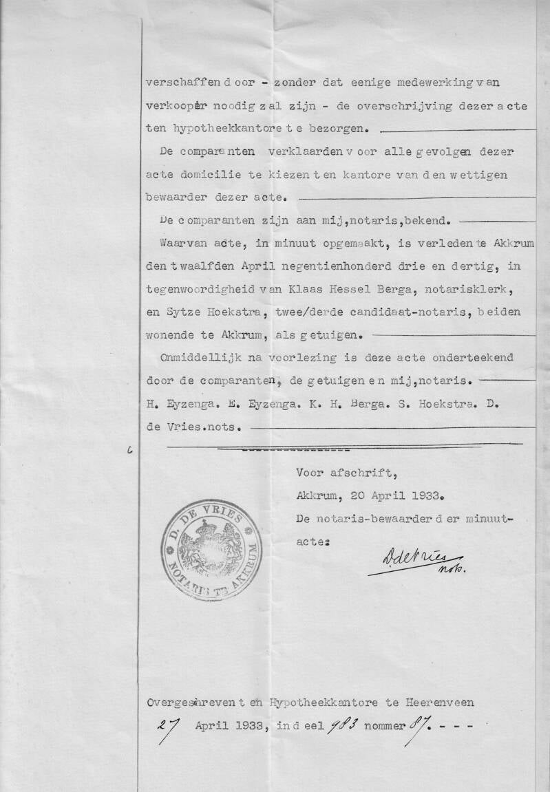 Onderstaand een koopakte uit 1933: "Een woonhuis met erf en bleekveld, nabij de Driegreppel op Vinkeburen te Akkrum". (2019 Finkebuorren 3, Hûs fan Jan Hollander. Mei tank oan © Jan Hollander).