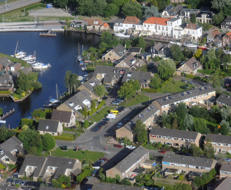 Boppe: De bûtenste râne fan de Himdyk mei u.o. de wenningen fan de famyljes Hemminga en Kamp.