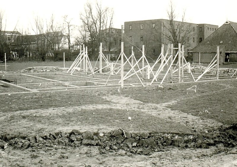 Boppe-boven: De bouw van de Kleuterschool it 'Beukerhof' in oktober 1966.