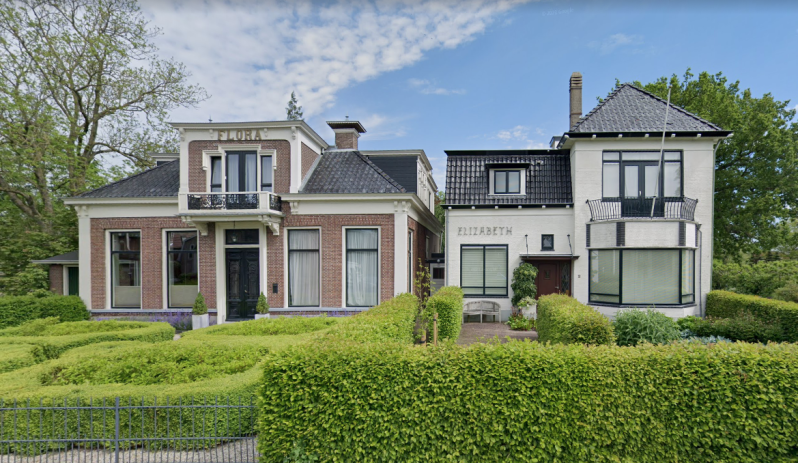 Boven: "Elisabeth'. In 1912, toen notaris van Slooten 'Flora' in eigendom kreeg, verkocht hij het oostelijk gedeelte van de tuin met koetshuis aan Jisk de Jong, Direkteur van de U.T. fabriek. Deze liet het koetshuis afbreken en bouwde hier een villa. Hij woont er tot zijn dood in 1943 waarna zijn zoon Eliza Wijbrand de Jong, veearts, bewoner wordt en het huis 'Elisabeth' noemt, naar zijn vrouw Elisabeth Heeringa. Na zijn doods het zijn dochter Sietske, getrouwd met Jan Zerb, veearts, die de villa bewoond. Daarna is het de familie Jelle van der Heide, die er vanaf 1975, nog steeds woont. (2021).