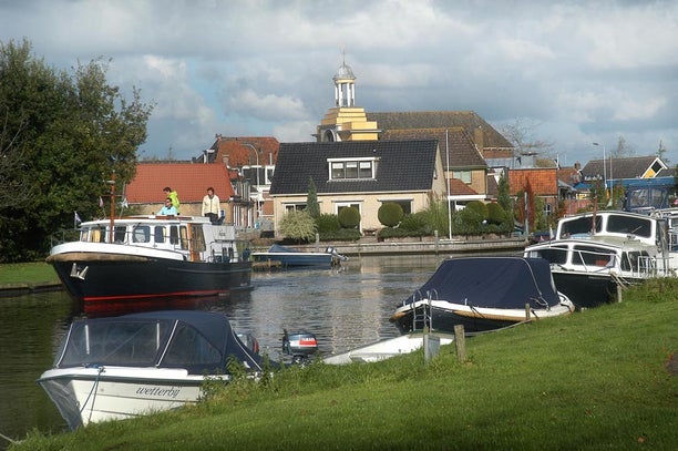 Boven: De Mounedyk gezien vanaf het Leechein/de Rakswâl. Op deze plek keerden voorheen de vrachtschepen die grondstoffen gelost hadden bij Ulbe Twijnstra's fabriek. Foto ca. 1950.