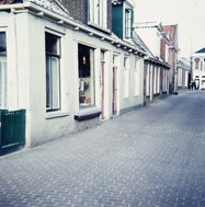 Onder een serie van negen foto's van het kruidenierswinkeltje van Pake Wiebe de Boer (met zijn dochter Hielkje) aan de Mounedyk. De twee meisjes op de linker foto in de middelste rij zijn Detsje en Grytsje, van bakker Stoker. De oudere mevrouw, op laatste foto van de bovenste rij is Gryt van der Woude. (Foto's jaren 1960-1965).