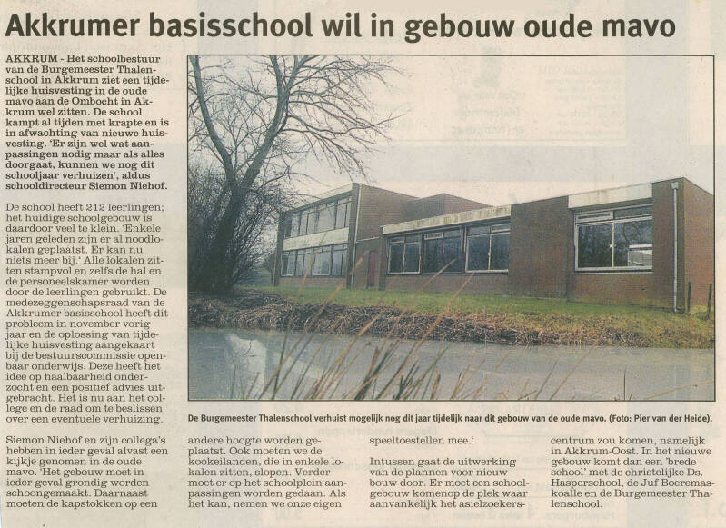 Op 15 oktober 1975 waard de nije MAVO oan de Ombocht boud en iepene mei de namme Iepenbiere MAVO skoalle Akkrum'. Hy krige dy namme neidat Boargemaster Anker sein hie de skoalle net nei him te ferneamen. De âlde ULO oan de Boarnsterdyk waard dermei oerbodich. By de iepening bleek de nije skoalle drekt al te lyts te wêzen. Nei sa'n 25 jier is de MAVO slúten en is dizze nei Grou ferhúze. De Burgemeester Thalen Skoalle siet doe ek al mei krapte en is doe nei de eardere MAVO oan de Ombocht ferhúze.