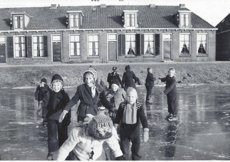 Boven: Winterplezier op de (spoor) Put bij Sechstjinhúzen/Sitadel ca. Het meisje rechts vooraan is Koosje Braam. links is Grietje Bakker en midden Anne Zwerver. (Foto:1956, Jan/John van Dam).
