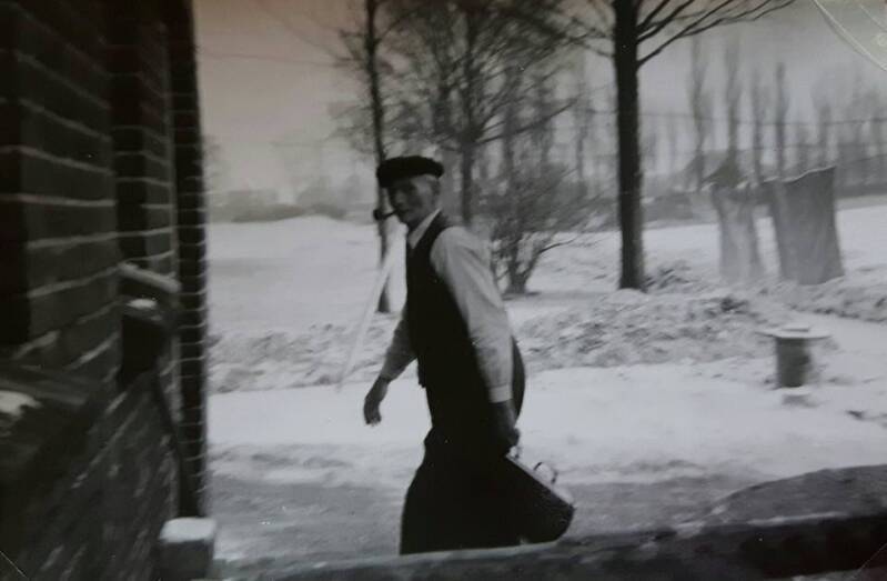 Dit is terug in de tijd . . . en wel 1958. En dit is Beppe Janna Hollander van den Bos, die naar huis fietst (het laatste huis, nr. 33, eerder A 109). Rechts: Pake Wouter Hollander heeft een kit kolen uit de schuur gehaald. (Foto's: © Froukje Nora Stoker-Hollander)