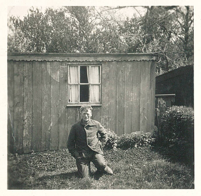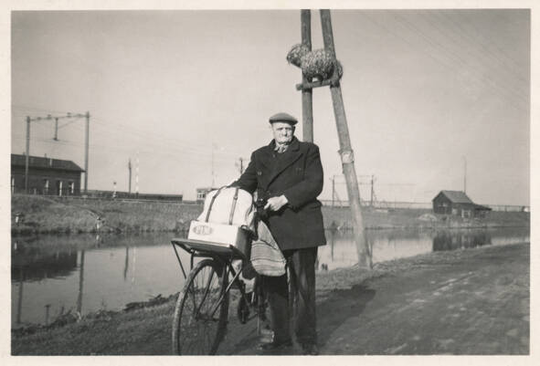 Boppe lofts: Werom yn de tiid . . . en wol 1958. Dit is beppe Janna Hollander-van den Bos, dy't nei hûs fytst. (It lêste hûs, nr. 33, earder A 109). Rjochts: Wouter Hollander hat in kit koalen út it hok ophelle. (Foto's: © Froukje Nora Stoker-Hollander)