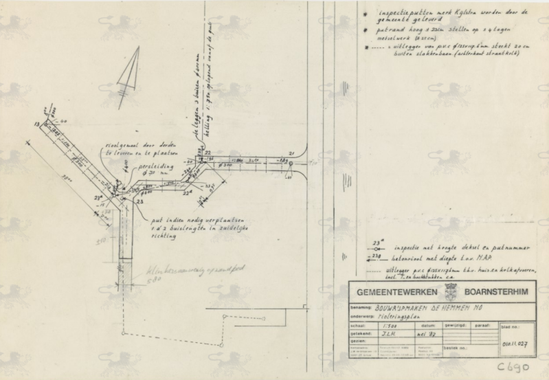 Boven: Het rioolstelsel van de WJK strjitte in 1987. (Tekening © Histoarisch Centrum Leeuwarden).