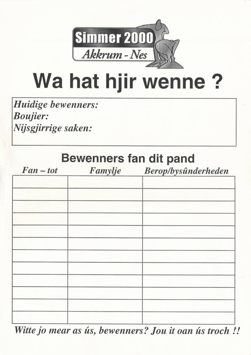 Yn 'e simmer fan it jier 2000 ha by in soad hûzen en winkels in biljet op it raam/doar plakt sitten. Dit om d'r efter te kommen wa dêr wenne hat. Om sa efter âld bewenners te kommen dy 't yn Akkrum en Nes wenne ha. Om dy te ynfentarisearjen by Akkrum Ald & Nij. Jo kinne as hjoeddeiske bewenner (hierder of eigner) in formulier delhelje-downloaden en útprintsje (SJOCH UNDER of HJIR NJONKEN) en op 't raam/doar plakke, sadat elkenien it sjen en lêze kin, om it sa út te wreidzjen ta in folslein argyfstik. Alfêst tige tank foar jo meiwurking. As der fragen binne heare wy dat graach. Sjoch hjirûnder.